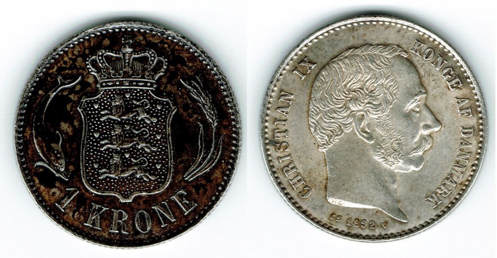 1 kr. 1892 i kv. (1+ - 01) Mørk bagside/lakeret?