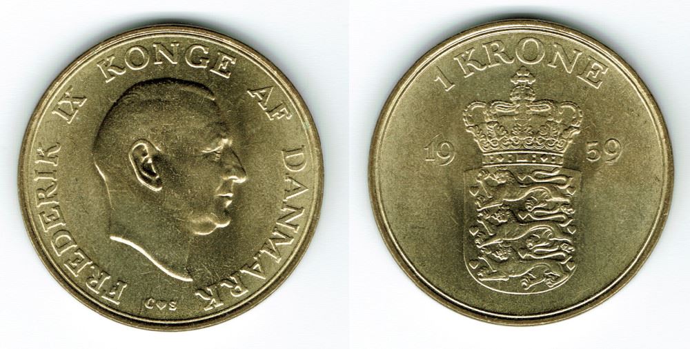 1 kr. 1959 i kv. (0) - lidt fladpræget i midterbøjlen
