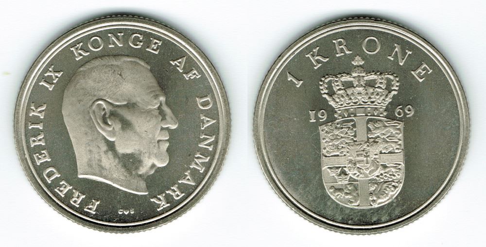 1 kr. 1969 i kv. 0 - M - har lidt medaljepræg over sig