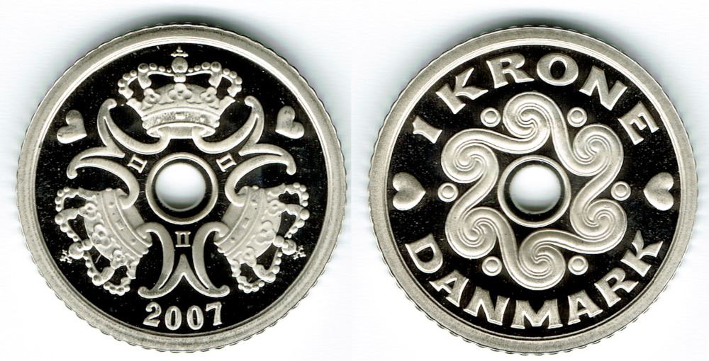 1 kr. 2007 i kv. M - fra Kgl. Proof møntsæt