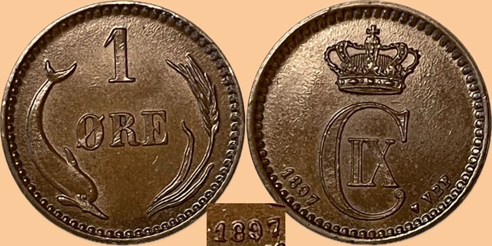 1 øre 1897 i kv. 01 - variant, hvor stempel er rettet fra 94 til 97