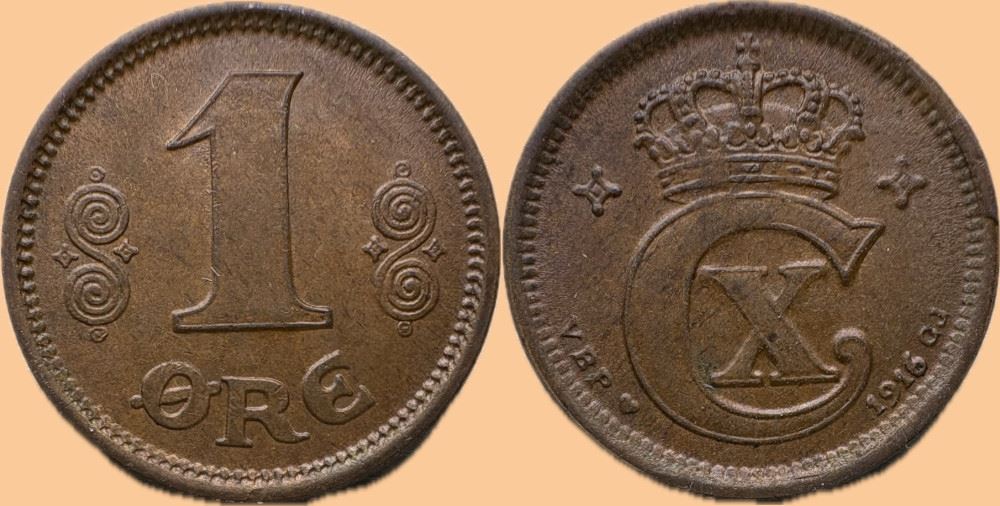 1 øre 1916 i kv. 01 - 0 - flot farve - svagt præg ved C og krone