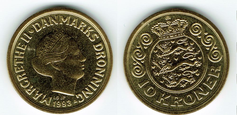 10 kr. 1993 i kv. S - fra Kgl. møntsæt