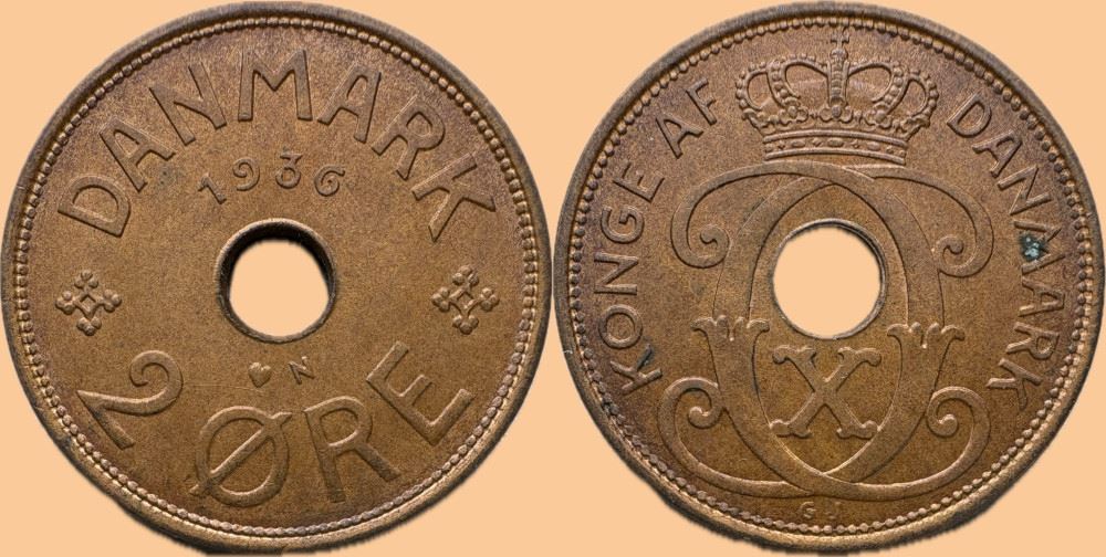 2 øre 1936 i kv. 0 - miniplet på M