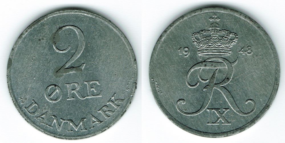 2 øre 1948 i kv. (0) - flot lys farve - enkelte pletter