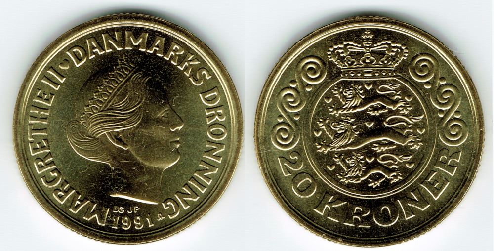 20 kr. 1991 i kv. S - fra Kgl. møntsæt