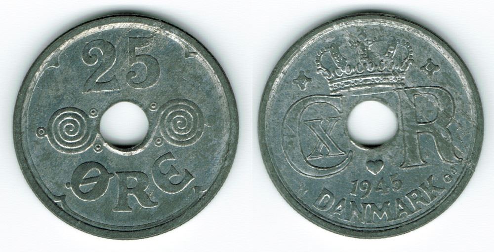 25 øre 1945 i kv. 01 - 0 - flot lys mønt, lidt flad krone
