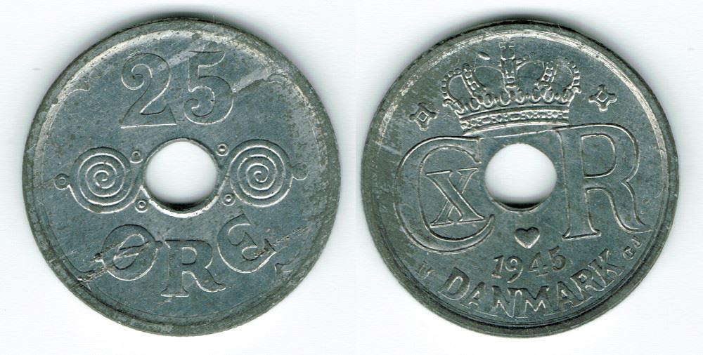 25 øre 1945 i kv. 01 - flot lys mønt, enkelte pletter
