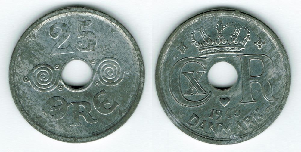 25 øre 1945 i kv. 01 - flot lys mønt, enkelte pletter