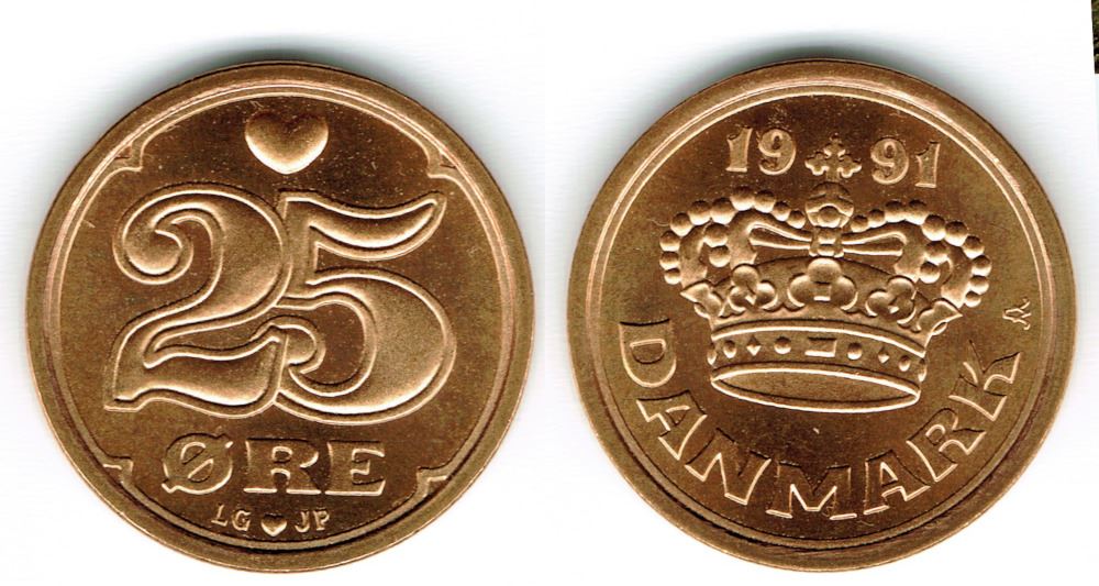 25 øre 1991 i kv. S - fra Kgl. møntsæt