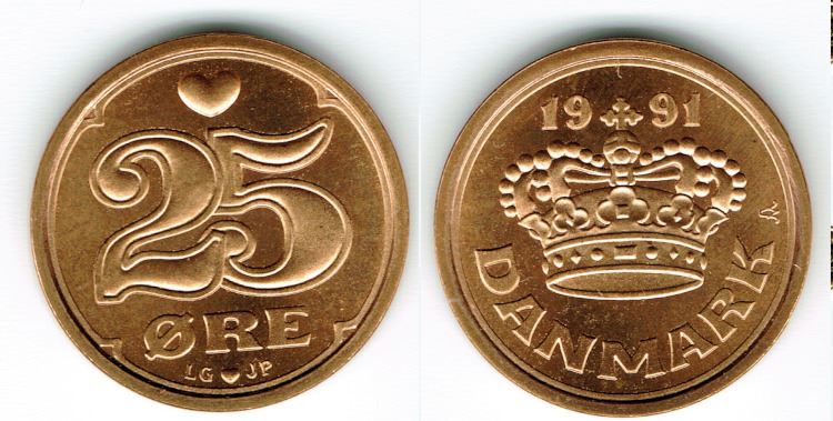 25 øre 1991 i kv. S - fra Kgl. møntsæt