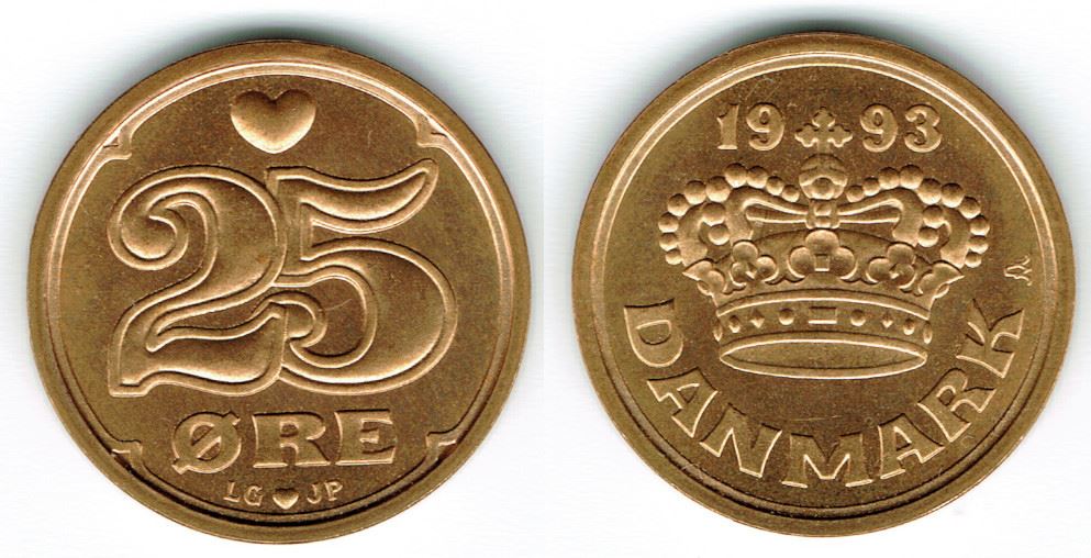 25 øre 1993 i kv. S - fra Kgl. møntsæt