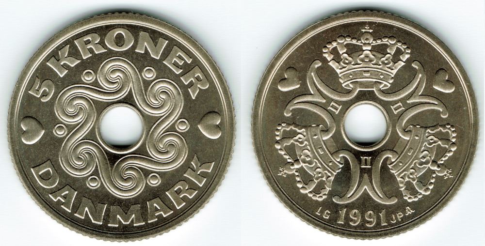 5 kr. 1991 i kv. S - fra Kgl. møntsæt
