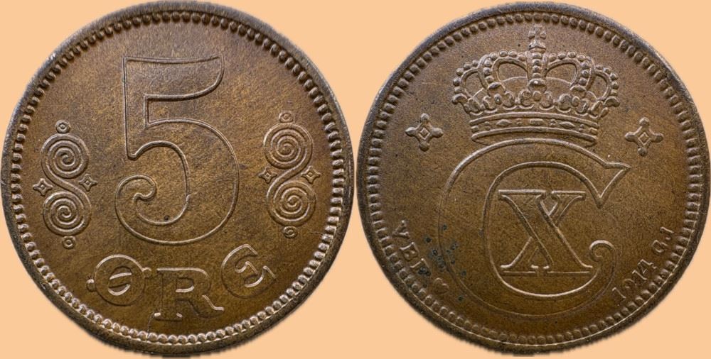 5 øre 1914 i kv. (0) - lidt minipletter på forsiden