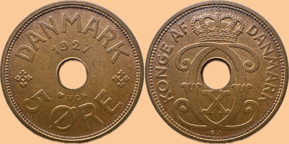 5 øre 1927 HCN i kv. 0 - flot lysebrun farve