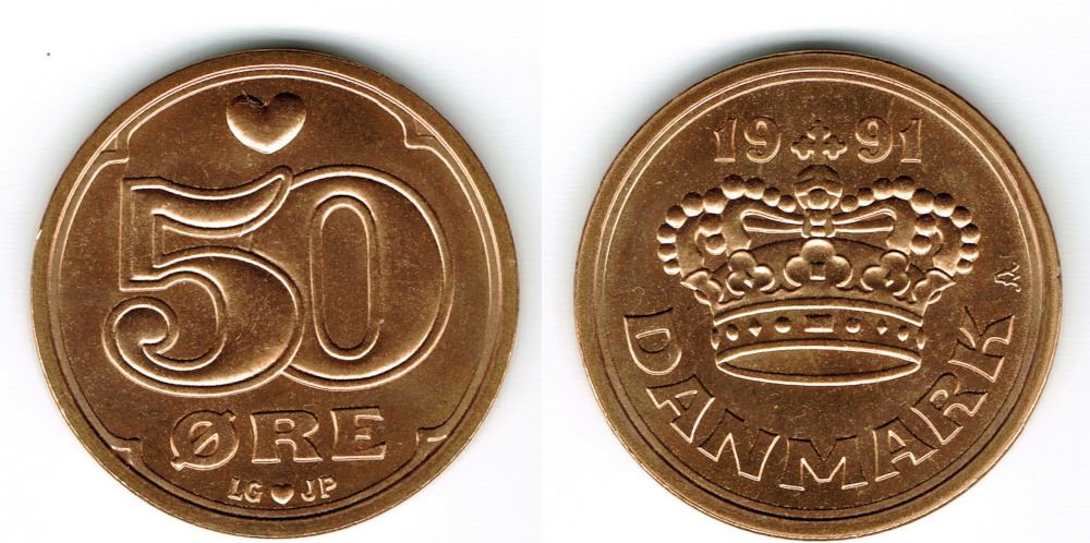 50 øre 1991 i kv. S - fra Kgl. møntsæt