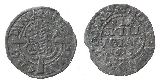 År 1615 - Chr. IV - 1 skilling i kv. (1+) - lille kantskade - H80D, Sieg 21.7
