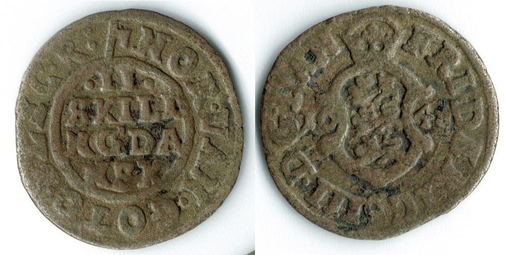 År 1648 - Fr. III - 2 skilling i kv. 1 Sieg 13.3 H122A