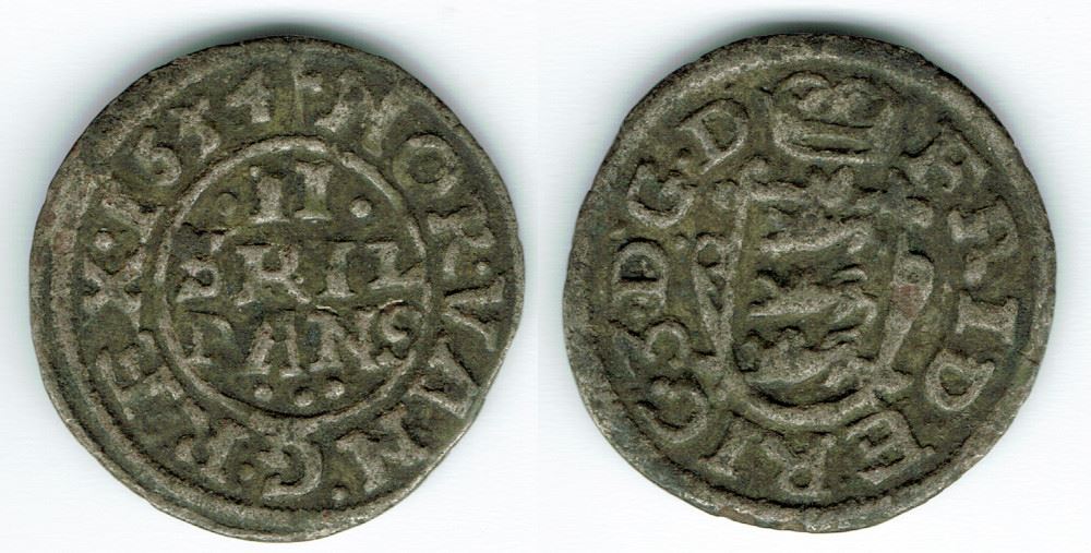 År 1654 - Fr. III - 2 skilling i kv. 1+ Sieg 16.2 H130B