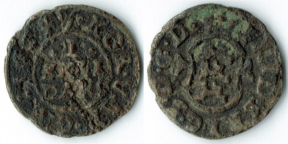 År 1654 - Fr. III - 1 skilling i kv. (1+) tæret Sieg 8.2 H131