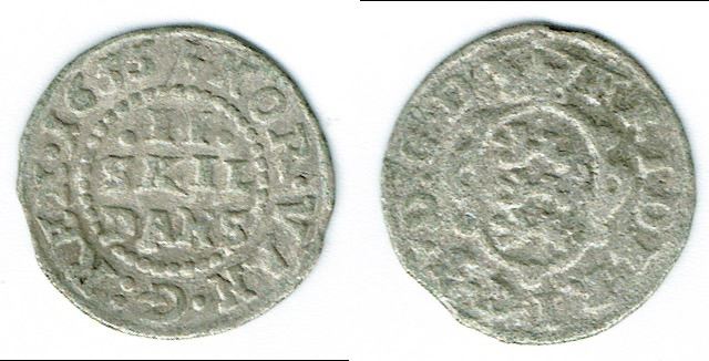 År 1655 - Fr. III - 2 skilling i kv. 1+/1 Sieg 17.3 H126B