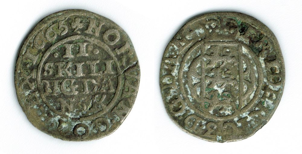 År 1665 - Fr. III - 2 skilling i kv. 1 Sieg 20.3 H134B
