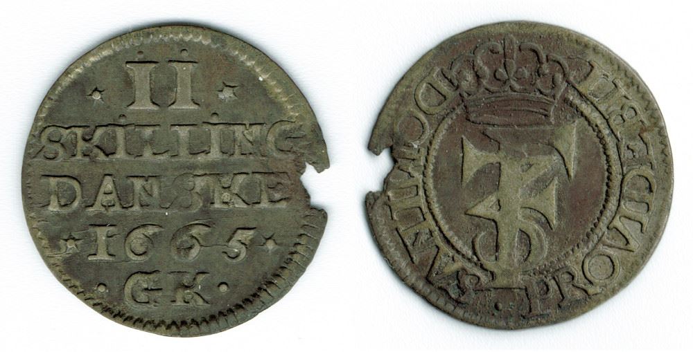 År 1665 - Fr. III - 2 skilling i kv. (1+) - kantskade Sieg 21.2 H138B