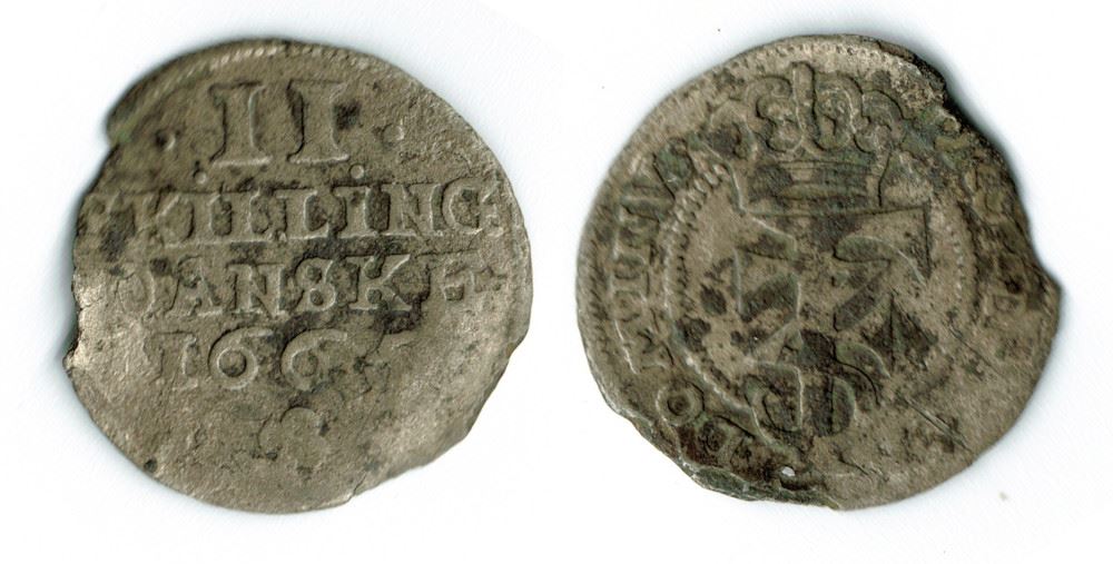 År 1665 - Fr. III - 2 skilling i kv. (1- - 1) - blanketskade Sieg 21.3 H138C