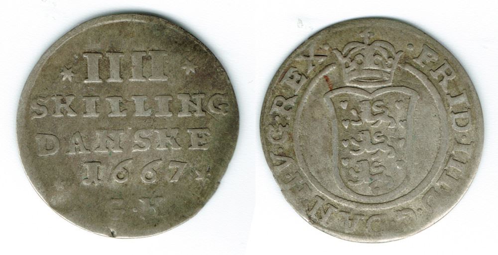 År 1667 - Fr. III - 4 skilling i kv. 1 Sieg 25.1 H137