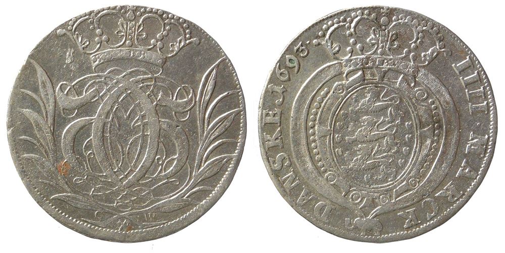 År 1693 - Chr. V - 1 krone Glückstadt i kv. 1+