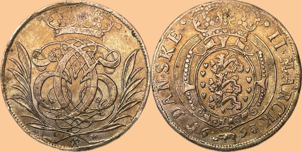 År 1693 - Chr. V - 2 mark Palmegrene i kv. 1+ H126a