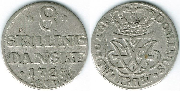År 1728 - Fr. IV - 8 skilling i kv. 1 Hede 53, Sieg 7 Sjælden iflg. Siegs