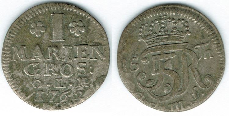 År 1762 - Fr. V - 1 mariengroschen i kv. 1+ Hede 11B, Sieg 49.2