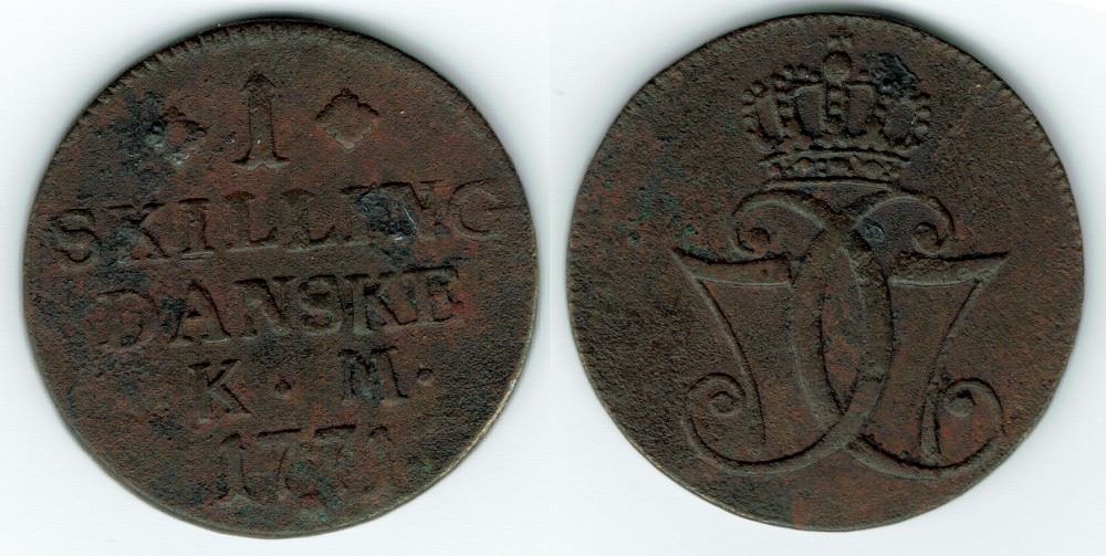 År 1771 - Chr. VII - 1 skilling i kv. (1+) - tæret Sieg 2.2