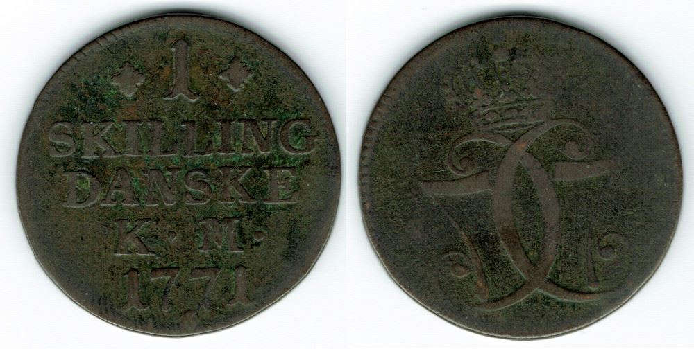 År 1771 - Chr. VII - 1 skilling i kv. 1 Sieg 2.1