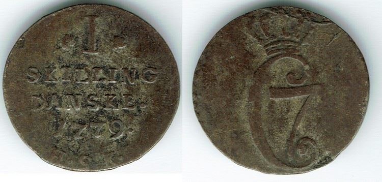 År 1779 - Chr. VII - 1 skilling i kv. 1 H34 Sieg 3