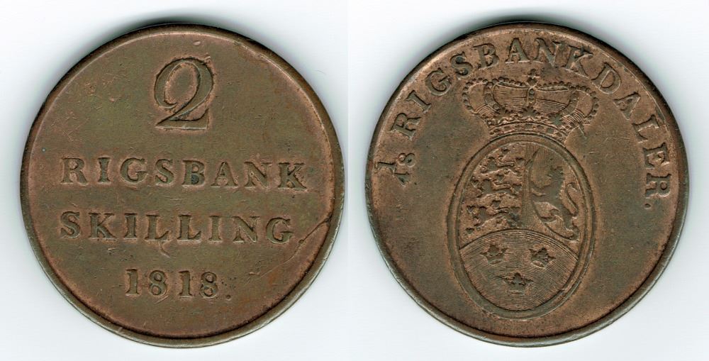 År 1818 - Fr. VI - 2 rigsbankskilling i kv. 1+ Sieg 18, Hede 36