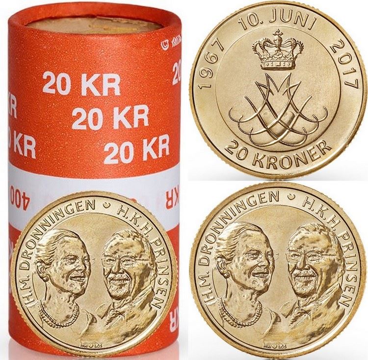Denne 20-krone erindringsmønt til almindelig cirkulation, udsendes i anledning af Hendes Majestæt Dronning Margrethes og Hans Kongelige Højhed Prins Henriks guldbryllup den 10. juni 2017.