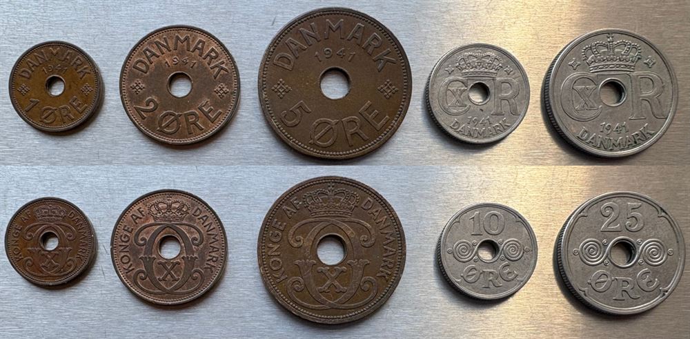Færøerne: 1 øre, 2 øre, 5 øre, 10 øre og 25 øre 1941 komplet i pæne kvaliteter