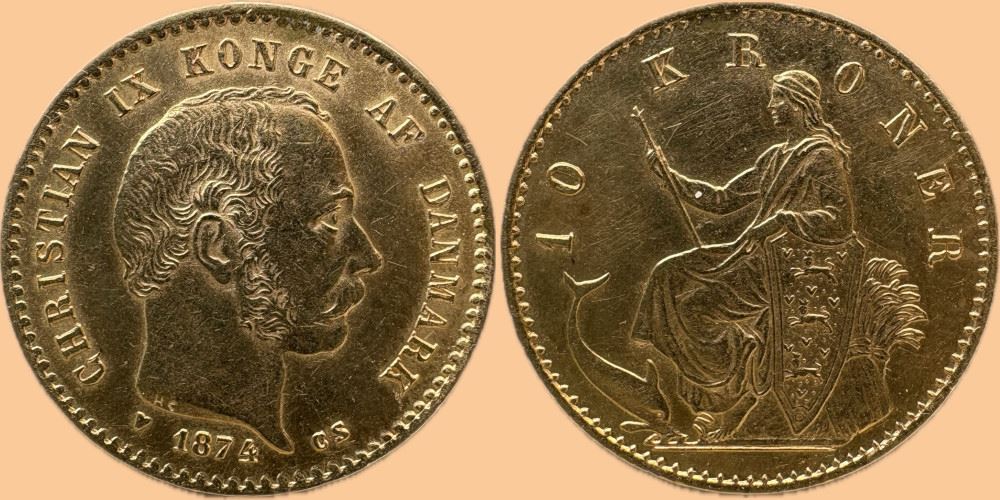Guld 10 kr. 1874 i kv. 1+ - 01