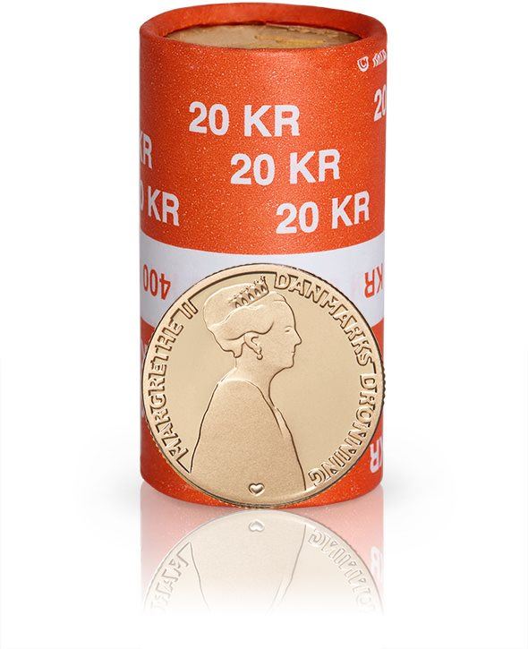 Denne 20-krone erindringsmønt til almindelig cirkulation, udgives i anledning af Hendes Majestæt Dronning Margrethes 50 års regeringsjubilæum.