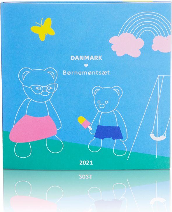 Børnemøntsættet består af Danmarks møntserie, dvs. 50-øren og 1-, 2-, 5-, 10- og 20-kronen, der er præget med årstal 2021.
