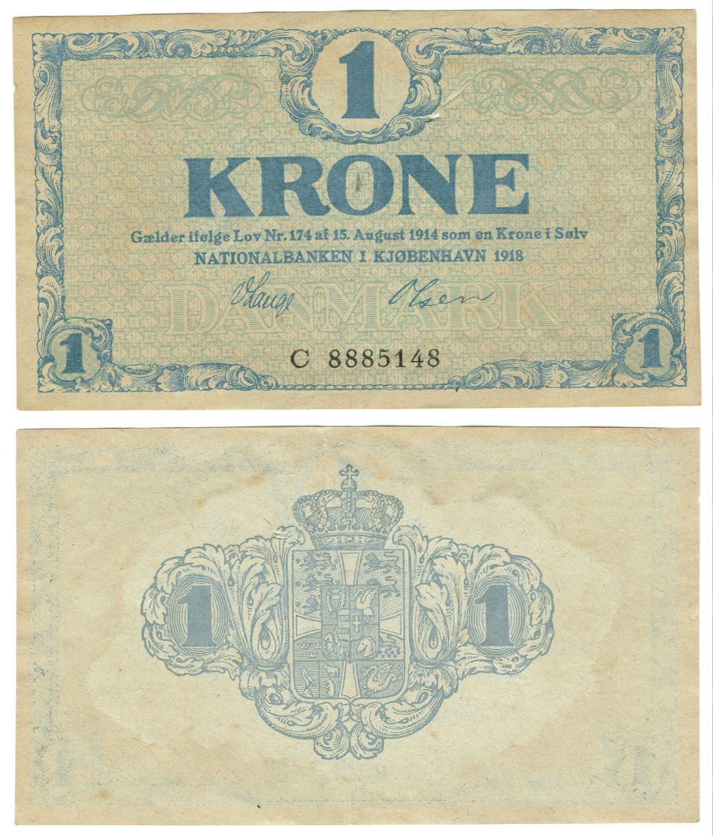 Seddel: 1 kr. 1918 bogstav C i kv. 1 - misfarvet og hul
