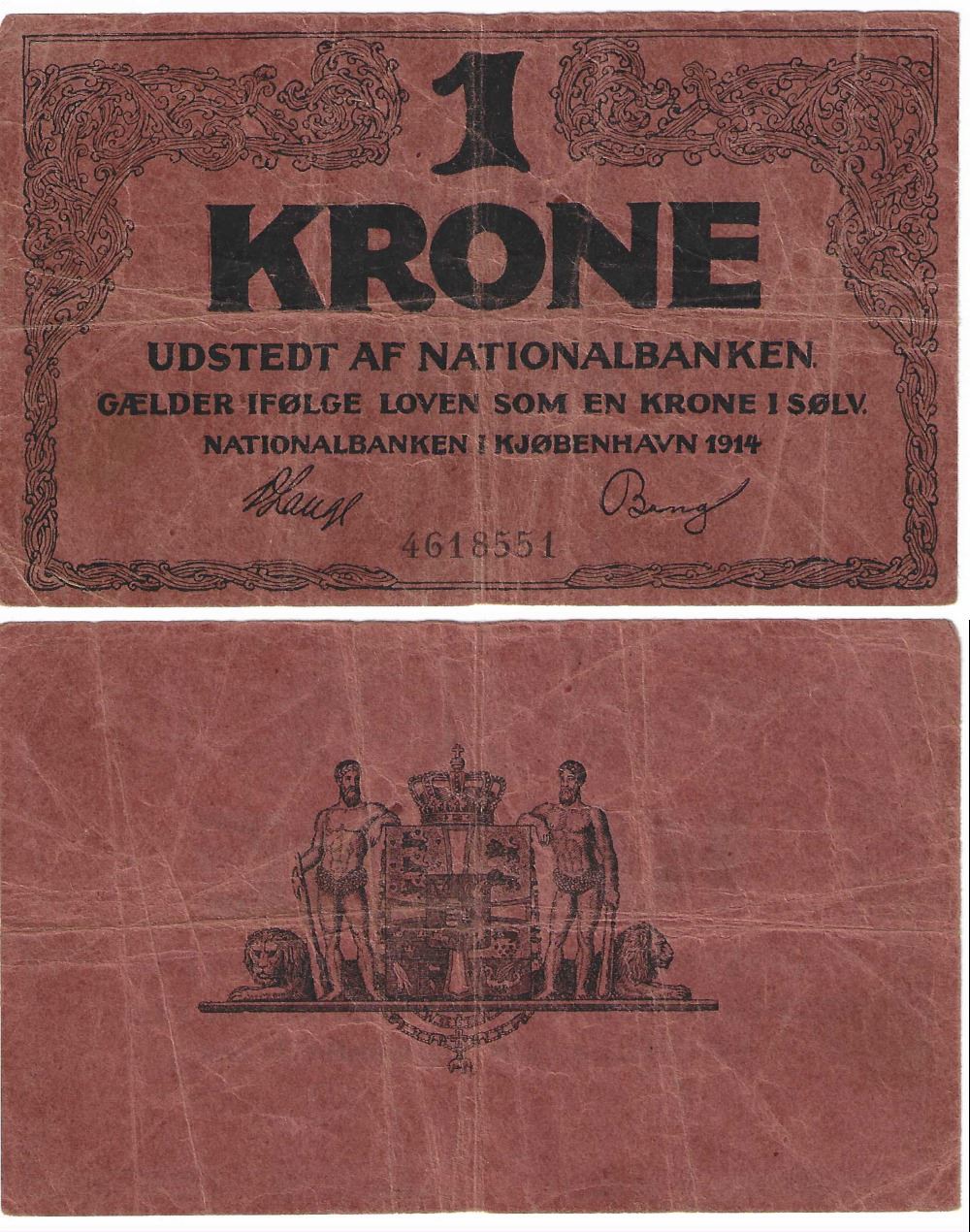 Seddel: 1 kr. 1914 falk 7 cifre i kv. 1- - 1