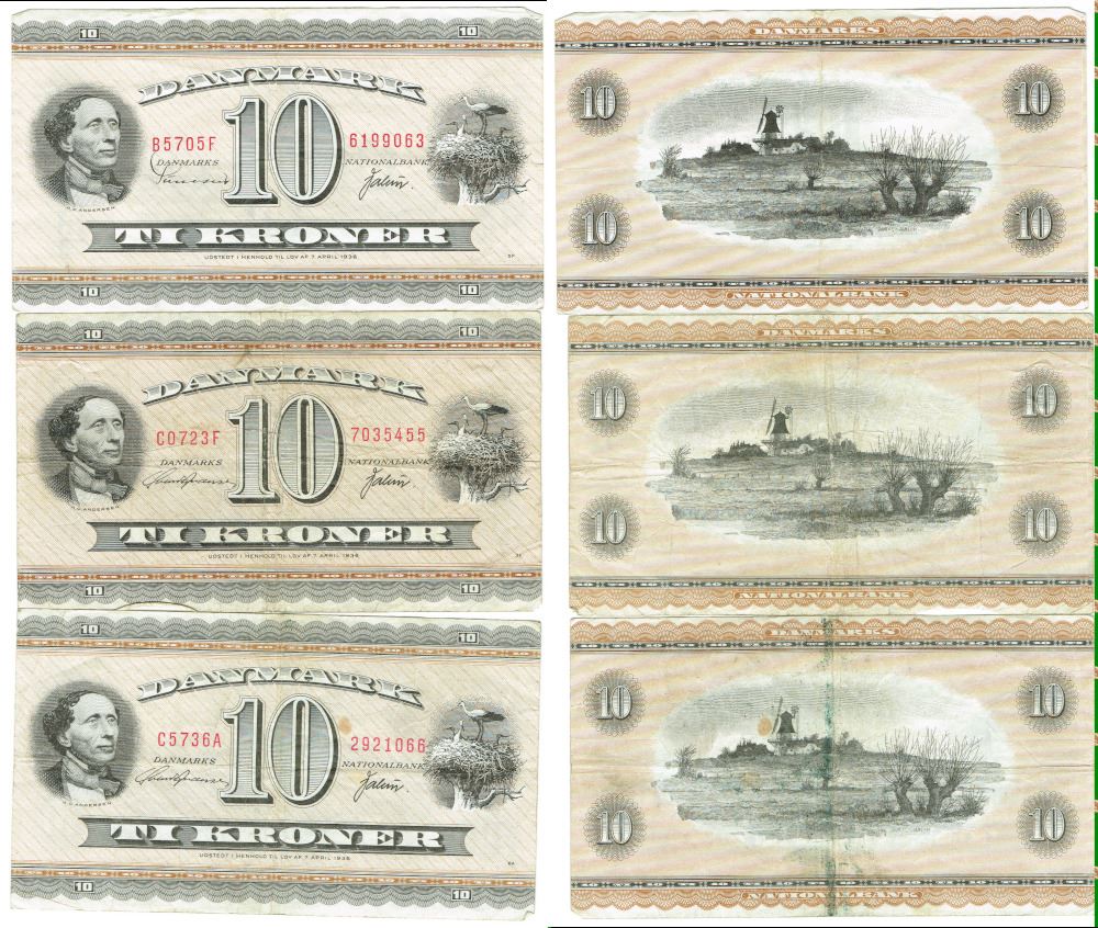 Seddel: 10 kr. 1970, 72 og 73 - 3 stk. i kv. 1-