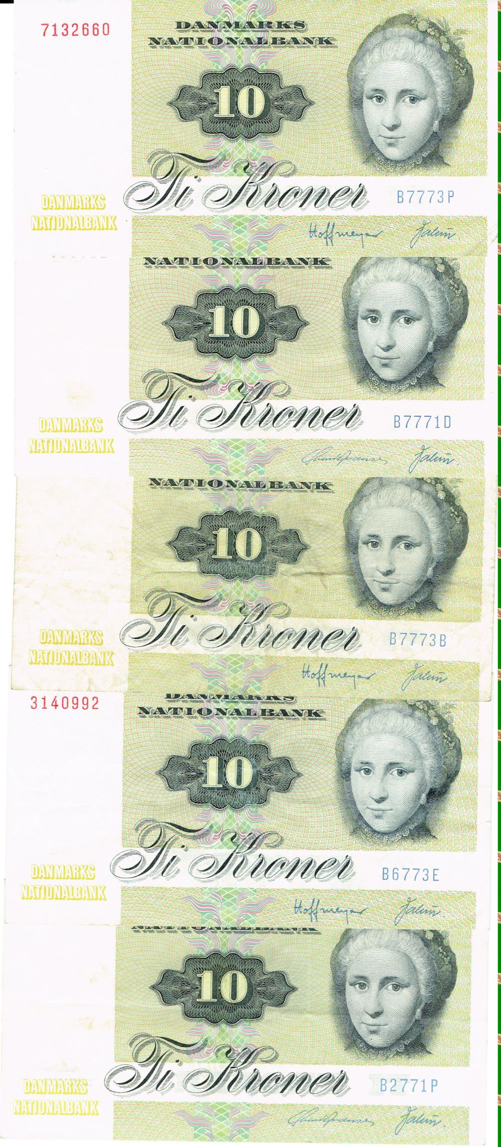 Seddel: 10 kr. 1977 - 5 stk. i kv. 1+