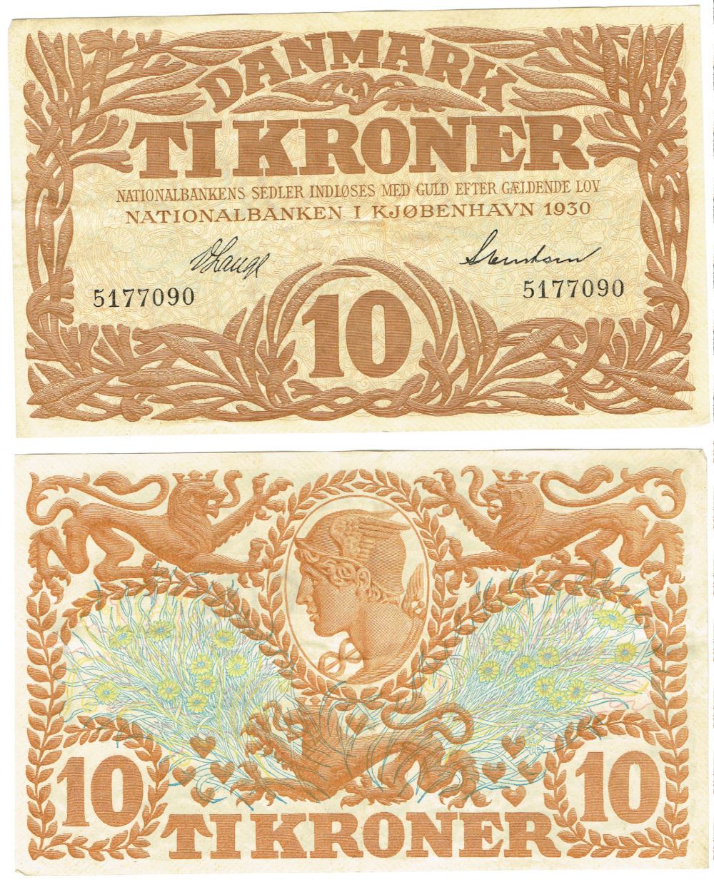 Seddel: 10 kr. 1930 uden bogstav i kv. 1+