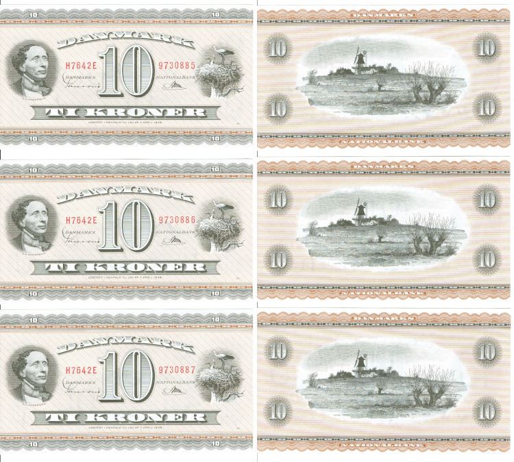 Seddel: 10 kr. 1964 H7642E i kv. 0 3 stk. fortløbende nr.
