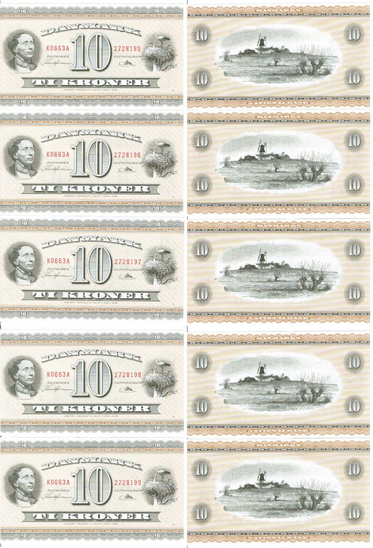 Seddel: 10 kr. 1966 K0663A i kv. 01 - 0 5 stk. fortløbende nr.