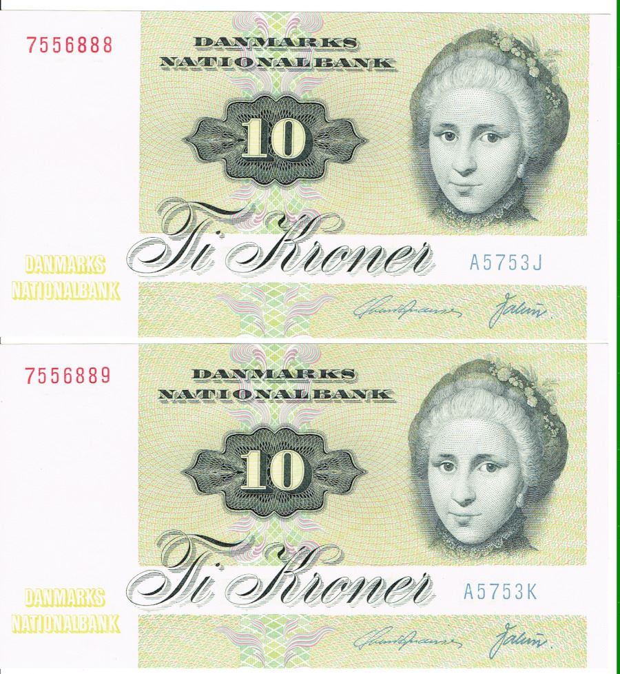 Seddel: 10 kr. 1975 A5753 i kv. 01 - 0 2 stk. fortløbende nr.